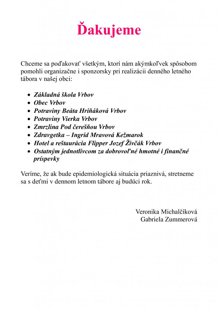 Poďakovanie organizátorov detského letného tábora