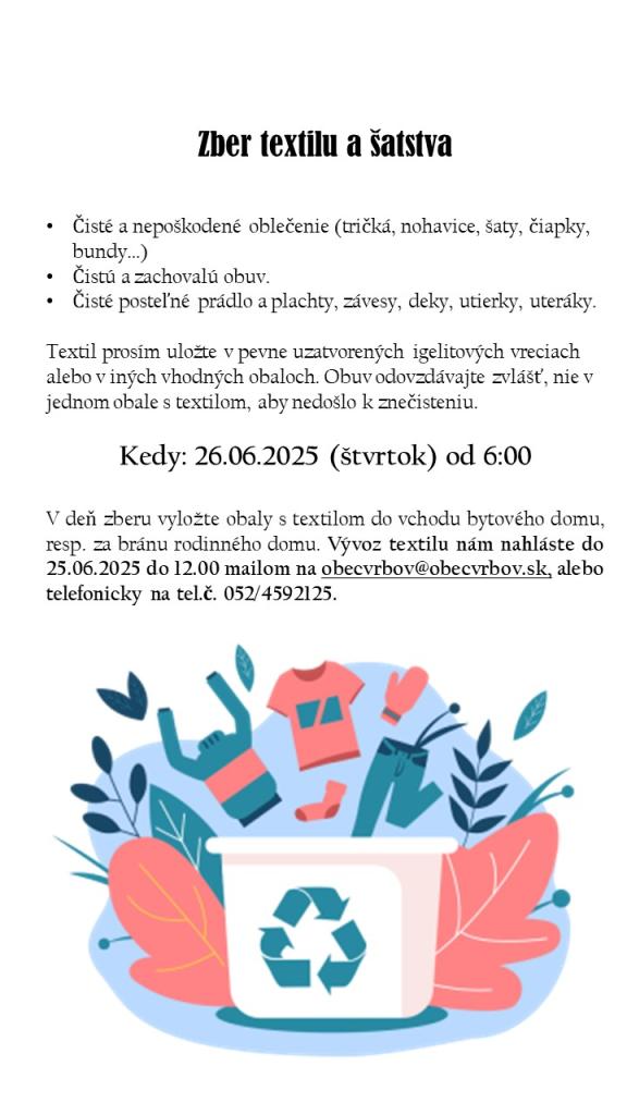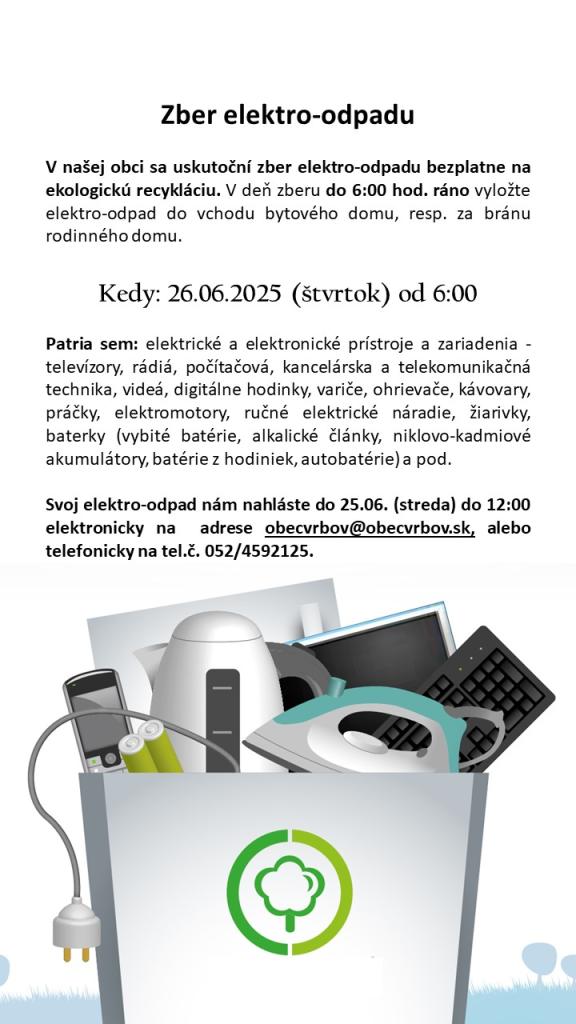 V našej obci sa uskutoční zber elektro-odpadu, textilu a šatstva bezplatne na ekologickú recykláciu. V deň zberu do 6:00 hod. ráno vyložte elektro-odpad, textil alebo šatstvo do vchodu bytového domu, resp. za bránu rodinného domu.